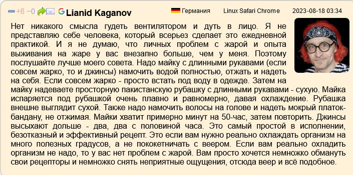 в-третьих и в главных, сам профиль получающегося охлаждения - сомнителен. Оно морозит шею и частично уши. По ощущениям это ближе к классическому способу простудиться на ровном месте (=на жаре), чем к комфорту. по груди и спине как тек пот - так и течет.