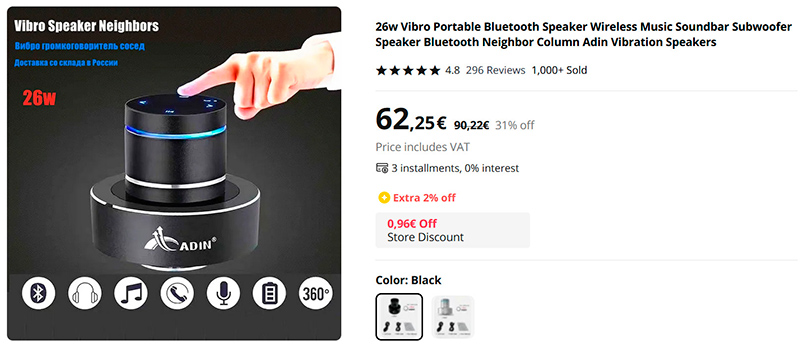 Мощная - аж 28 Вт - вибрационная беспроводная колонка с присоской. У меня подобная была - это реально классно работающая штука. Прикрепляете ее присоской к столу или к стеклу окна - и стол или окно становятся сабвуфером! Звучит реально классно и дает глубокие и насыщенные басы. И есть еще одно применение этой колонки. Соседи совсем берега потеряли: врубают музыку по ночам или орудуют перфоратором рано утром? Присоедините колоночку к общей с соседями стене (потолку) и врубите погромче. В отзывах пишут, что необходимого эффекта добиваешься очень быстро.