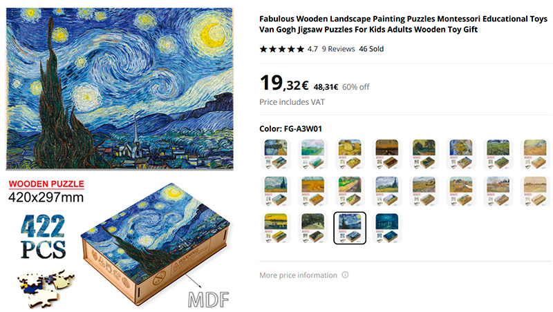 Нечто особенное для любителей пазлов. Во-первых, это не просто пазл-картинка, а картины Ван Гога. Во-вторых, все элементы пазла сделаны из дерева, так что после окончания сборки пазла его можно повесить на стену (желательно предварительно покрыть лаком). Смотрится прям здорово. И выбор картин большой. Каждый пазл - 422 элемента.