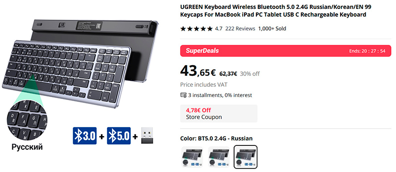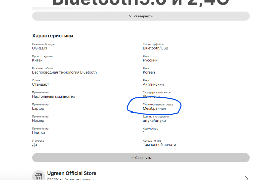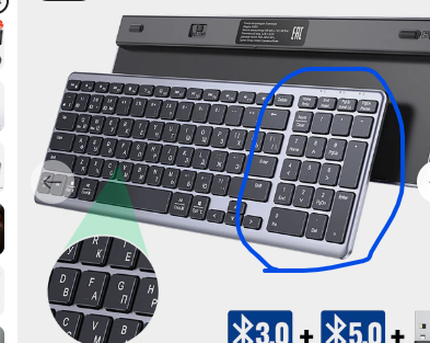 Качественная полноразмерная мембранная клавиатура от Ugreen с американской раскладкой. Есть версия с нанесенной кириллицей. Для ПК, планшетов, умных телевизоров и так далее. Подключается по Bluetooth, также снабжена адаптером для подключения по радиоканалу. Отзывов за двести сотен, практически все хвалят.