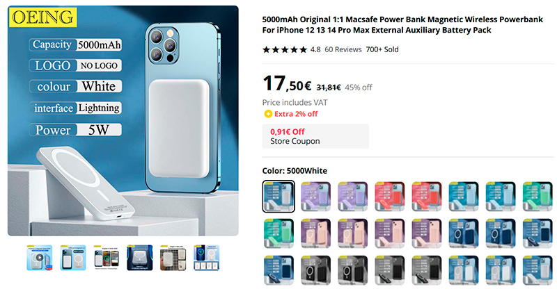 Оригинальный аккумулятор MagSafe на 5000 мАч с мощностью 5 Вт стоит €99. А вот неоригинальный разных цветов.