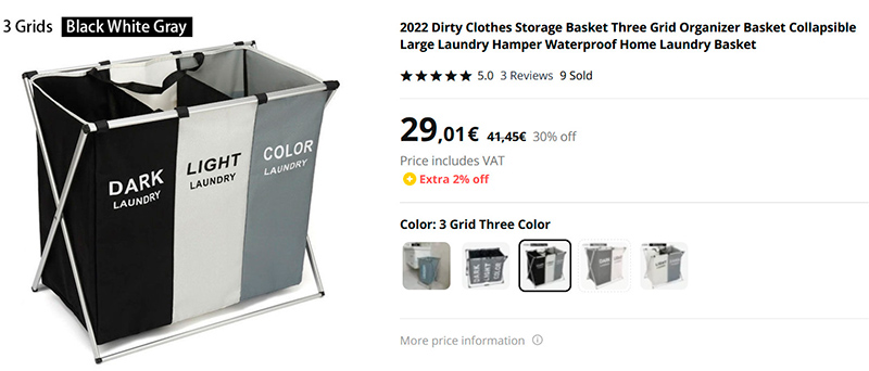 Домашняя складная корзина для белья с сортировкой на белую, черную и цветную одежду. В сложенном виде места почти не занимает. Имеет ручки, за которые мягкую емкость с бельем можно вытащить из металлического основания и отнести к стиральной машине дома или прямо с ней отправиться в общественную постирочную.