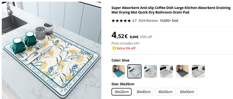 Симпатичные супервпитывающие коврики для сушки посуды, которые очень быстро впитывают воду. Четыре размера, шесть расцветок.