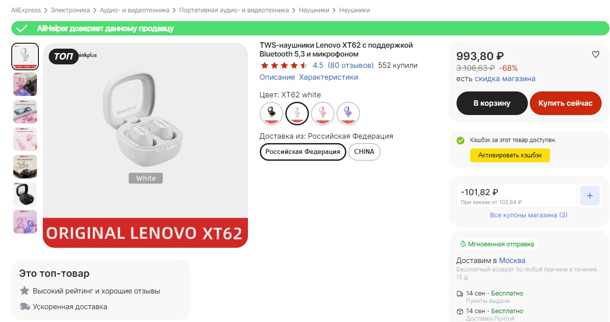 Доставка из РФ. Такая цена с купоном продавца на 407₽ от 408₽. Сенсорное управление, Bluetooth 5.3, встроенный микрофон. Работают до 5 ч и до 25 ч с подзарядкой от кейса.