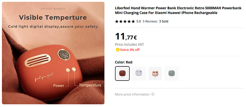 В холодную погоду быстро разряжается смартфон и мерзнут руки? Тогда это штука точно для вас - внешний аккумулятор на 5000 мАч с функцией грелки. Если включить его в режим нагрева, то где-то за 30-60 секунд устройство нагреется до температуры 52 градуса, и температура будет отображаться на дисплее. Держать тепло оно сможет 3,5-4,5 часа, однако чем холоднее вокруг, тем меньше будет это время. При переключении в режим внешнего аккумулятора, на дисплее будет показываться оставшийся заряд.