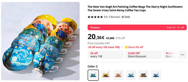 Чашки с блюдцами с картинами Ван Гога. Можно купить один комплект, а можно несколько разных - для семьи или для гостей. Меня прям впечатлило, заказал, тем более что чашки выглядят очень изящно. Кстати, сколько ни заказывал на Aliexpress всякую посуду, всегда всё приезжало в целости и сохранности: они реально хорошо ее упаковывают, надежно.