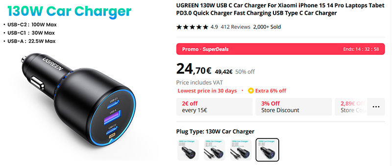 Для таких случаев вот хороший вариант - мощный зарядный адаптер для машины от Ugreen. Три порта - на 22,5 Вт, 30 Вт и аж 100 Вт. Поддерживает PD 3.0, так что спокойно может заряжать ноутбуки. Ну и смартфоны, разумеется. Суммарная мощность аж 130 Вт!