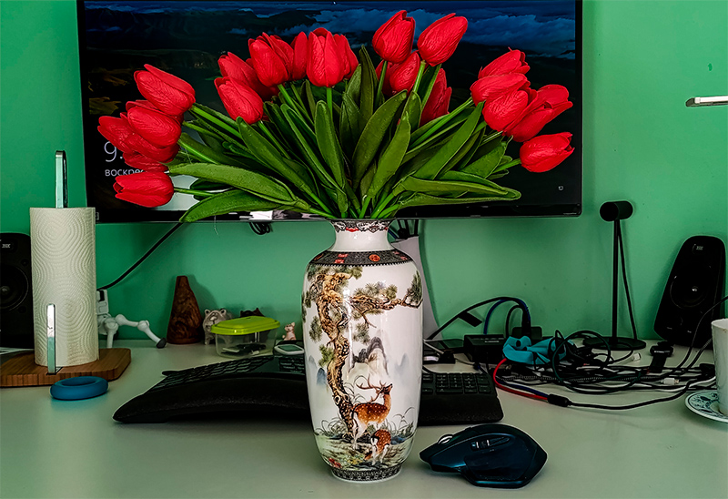 Но я не могу остаться без подобной вазы, я к ней слишком привык. Кроме того, куда без неё я буду ставить свои экологичные искусственные тюльпаны, которые достаточно раз в несколько месяцев обдать водой из душа, и они как новенькие? И не осыпаются, между прочим! Зато глаз радуют - как натуральные. А если хочется, чтобы они пахли тюльпанами, то можно купить прыскалку с соответствующим запахом (тюльпанный альдегид), и букет время от времени опрыскивать. Пионер, береги природу, мать твою!
