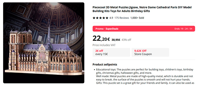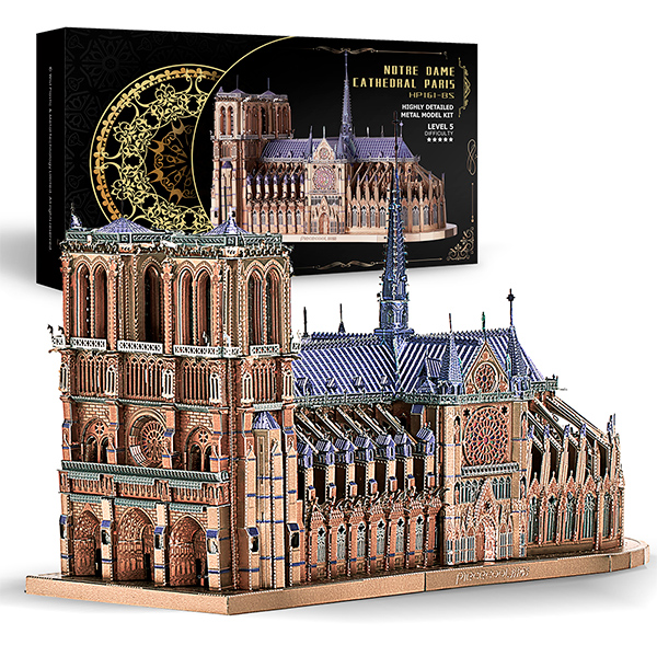 Для любителей конструкторов - металлическая 3D-модель Собора Парижской Богоматери от известного производителя Piececool. 382 детали, размеры готовой модели - 6,1х15,1х10.7 см. 175 отзывов из которых 163 - пятерки и 9 - четверки. В отзывах много фото уже собранной модели.