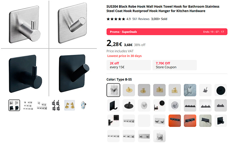 Большой выбор как одиночных крючков для одежды, полотенец, всякой утвари и так далее, так и целых вешалок. Разные цвета, разные конфигурации. И все они крепятся на ленту 3M, так что устанавливаются мгновенно и держатся крепко.