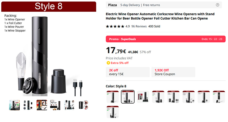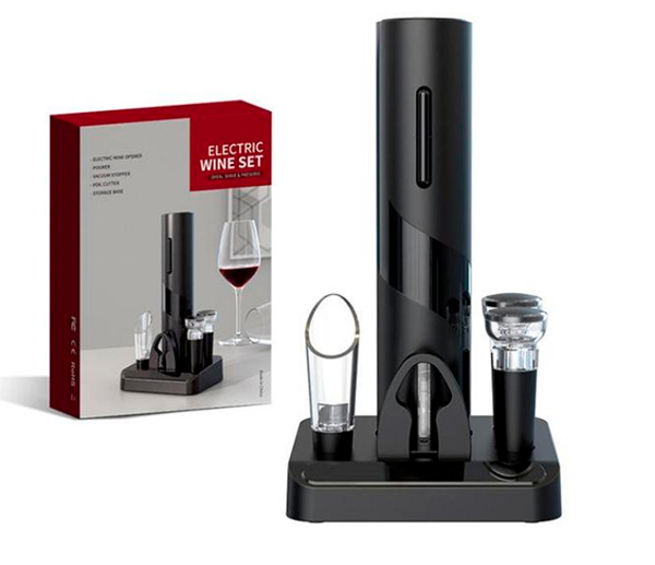 Разнообразные наборы с отличным электрическим пробочником (я только таким и пользуюсь много лет). Мне больше всего нравится набор Style 8 (который на картинке): пробочник, устройство для срезания крышечки фольги, аэратор, который вставляется в горлышко бутылки, пробка с помпой для сохранения вина в уже открытой бутылке, кабель для зарядки.