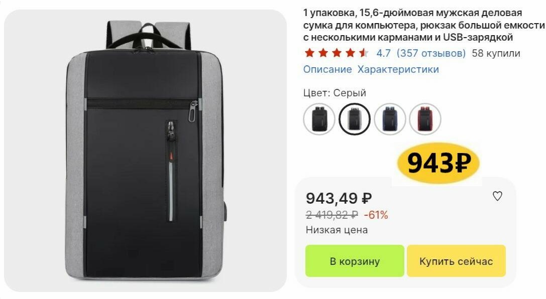 Строгий дизайн, сшит из водонепроницаемой ткани, вмещает ноутбук с диагональю до 15.6", несколько карманов с качественными замками, есть USB-порт для подключения повербанка. Четыре расцветки на выбор.