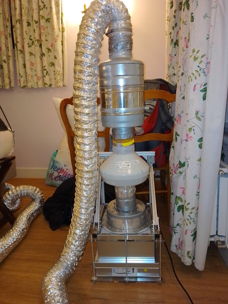 На картинке -- в собранном состоянии с турецкими фильтром и префильтром. Фильтры были расчитаны на 2xбОльшую дуйку, но я хотел, чтобы не шумно было. Этот портативный, я его вожу с собой, когда в командировку езжу, по отелям. В Парижском отеле жутко воняло плесенью (не смотря, что 300 евриков за ночь).
