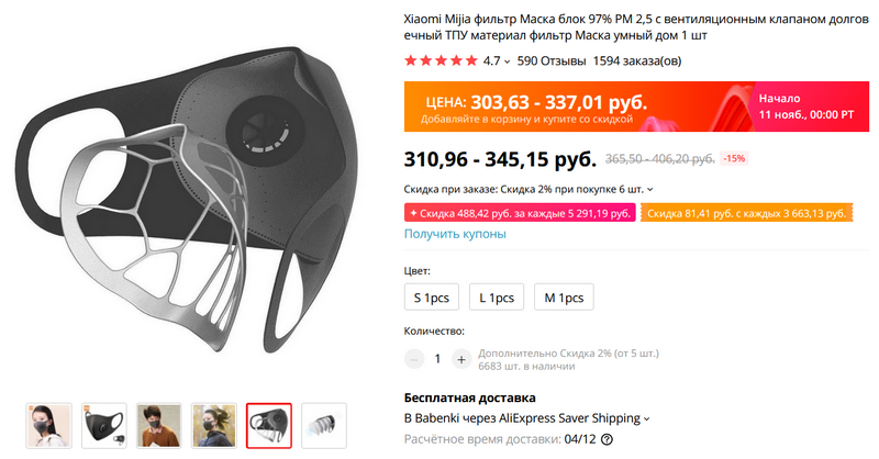 Крайне актуальный, к большому сожалению, аксессуар в наши сложные времена - маска для лица из полиуретана, которую выпустила компания Xiaomi. С вентиляционным клапаном, позволяет достаточно комфортно дышать, фильтрация более 97% PM2.5, что бы это ни означало, выбор пищевых продуктов, интимная личная защита - это я, конечно же, цитирую описание. Три размера: маленький, средний, большой. Внутри имеет специальный каркас - именно чтобы облегчить дыхание. Интересно, я раньше такое не встречал. Заказал себе, попробую. Эта музыка совершенно точно будет еще долго, так что пускай пришлют, проверю. Xiaomi все-таки.