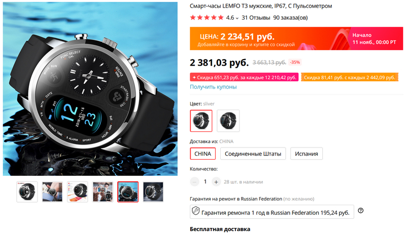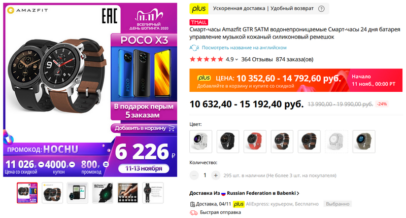 На умные часы Amazfit GTR (вот мой обзор) обещают на распродаже 11.11 уронить цену чуть ли не до 6 тысяч (с промокодом и купоном). Если кто соберется покупать, кладите в корзину, на распродаже проверите, какая цена на них будет. Ну и замечу, что здесь представлены почти все варианты оформления этих часов (шесть из семи).
