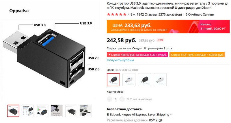 Отлично выполненный концентратор для ноутбука - сверхкомпактный, удобный: один порт USB 3.0, два порта USB 2.0. Также есть более дешевый вариант с тремя портами USB 2.0. Заказал себе три штуки с USB 3.0: для моего ноута, ноута жены и ноута Юного Каталана.