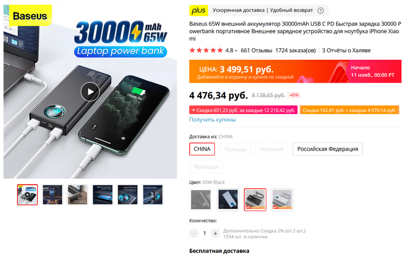 Так же Baseus, но powerbank-адаптер. Думаю может оказаться полезным несмотря на всего 2 выхода (А и С) и китайскую(вроде) вилку. Честно говоря сам не заказывал - жаба душит. Но вдруг товарищи поделятся впечатлениями