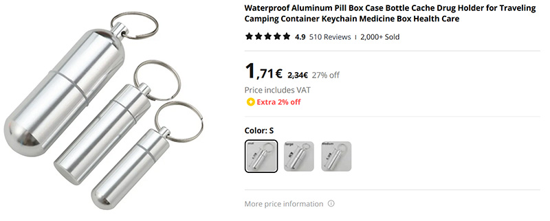 Многие люди вынуждены ежедневно принимать таблетки в определенное время, и нередко забывают их взять с собой из дома. Чтобы уж точно их не забывать, можно приобрести вот такой алюминиевый контейнер для таблеток, который можно носить с собой с ключами в качестве брелока. На выбор три размера - от 5 до 8 сантиметров.