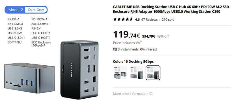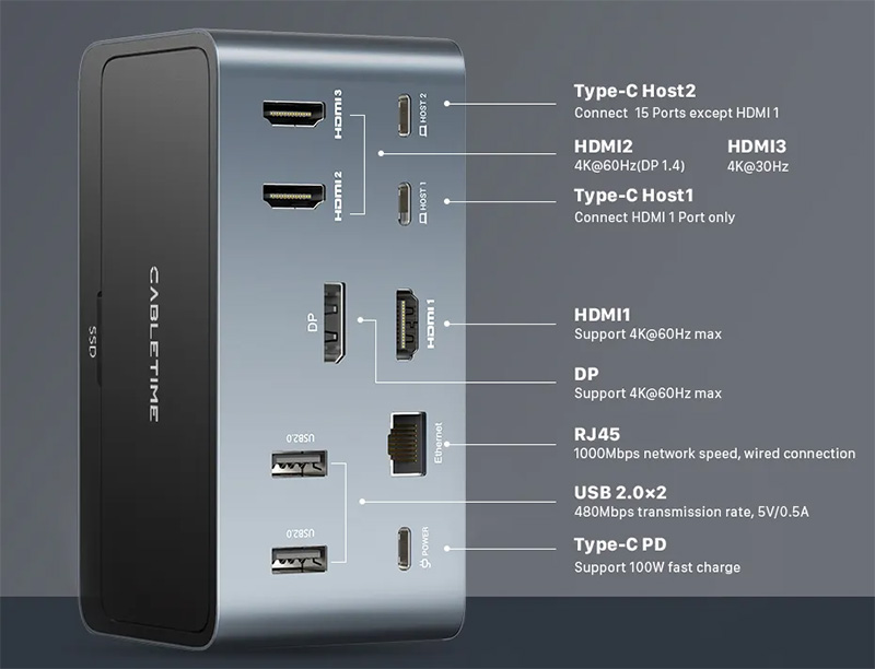 Очень быстрое и многофункциональное устройство "16 в 1": USB-хаб с максимальной скоростью передачи данных для всех подключенных устройств одновременно, разрешение 4К для нескольких мониторов (до 4 можно подключить), зарядка до 100 Вт для подключенного устройства через Type-C, гигабитный Ethernet, а еще сюда можно установить высокоскоростной SSD M.2, превращая хаб во внешний быстрый накопитель. Там три модели, немного отличающиеся конфигурациями. Очень продвинутые устройства.