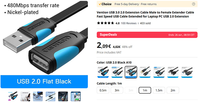 Всегда полезные удлинители для USB-кабелей. Особенно часто они бывают нужны для удобного подключения флешек или какой-то периферии. Данный вариант хорош тем, что удлинители качественные, имеют несколько вариантов расцветок и есть хороший выбор размеров от 0,5 метра до аж 5 метров.