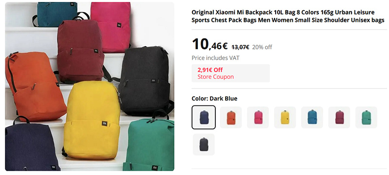 У компании Xiaomi есть очень популярная модель небольшого рюкзака для прогулок, вмещающего 10 литров. Удобные, выпускаются самых разных расцветок от строгих до веселеньких, есть один большой карман с отсеком для планшета, два маленьких по бокам и один сзади. Изготовлен из водоотталкивающего материала, так что дождь ему не страшен.