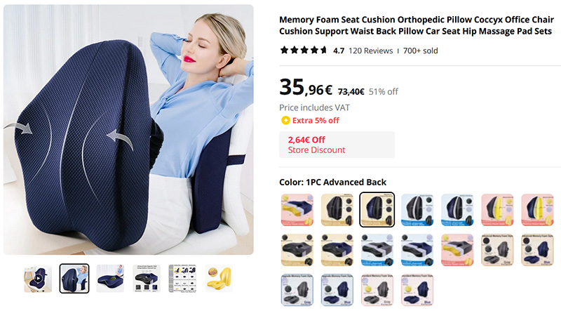 Ортопедические подушки различных конфигураций с поддержкой позвоночника и поясницы для офисных кресел. Имеют эффект памяти.