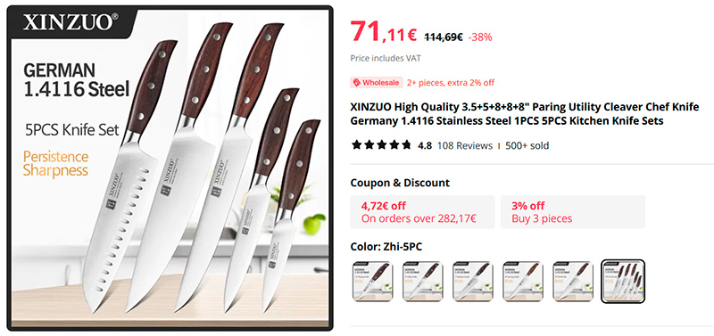 Мне в свое время порекомендовали ножи Xinzuo как недорогие, но при этом очень качественные. Я себе купил шеф-нож Xinzuo и до сих пор им пользуюсь с большим удовольствием (другое дело, что он у меня задействован довольно мало, потому что мясо-рыбу я обычно покупаю порционные). Мне этот нож так понравился, что я заказал такой же и подарил его другу Серхио (недавно я про него писал в статье о паэлье), который, в отличие от меня, прям кулинар-кулинар: ему нож тоже очень понравился, он года два им пользовался, а потом решил взять полный набор ножей этого производителя. Они разные ножи выпускают, но у него (и у меня) шеф-нож вот этой серии, и именно эти ножи он и купил.