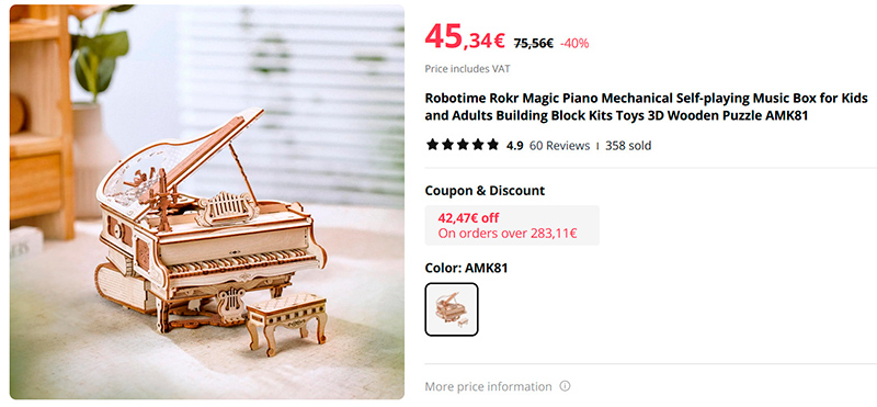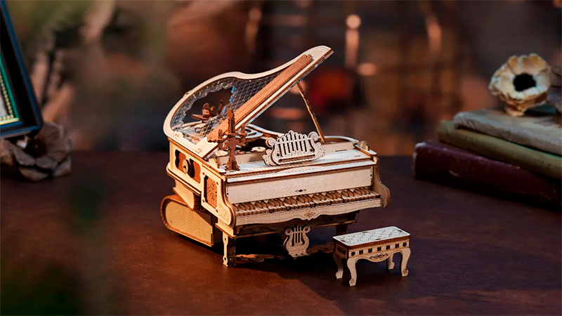 Для любителей деревянных конструкторов - вот такой шикарный рояль от фирмы Robotime. Он еще и сам играет: правда, не удалось выяснить, умеет ли он исполнять "Элегию" Масне. Размер модели 140х170х125 мм, 223 детали.