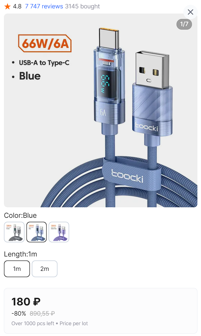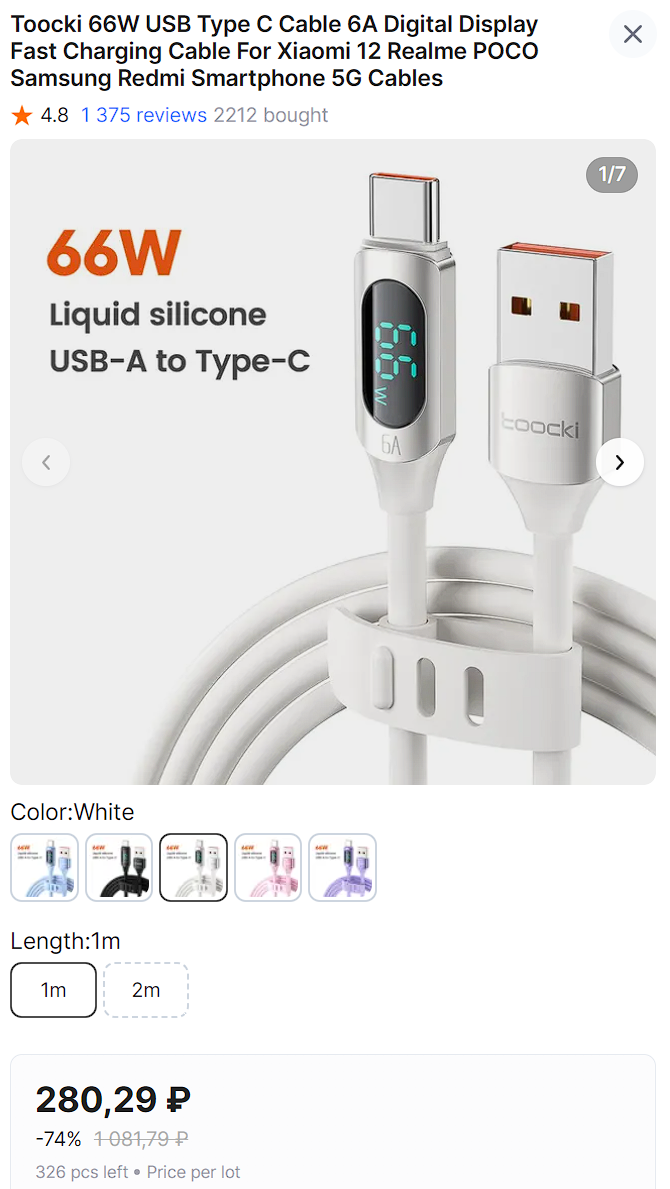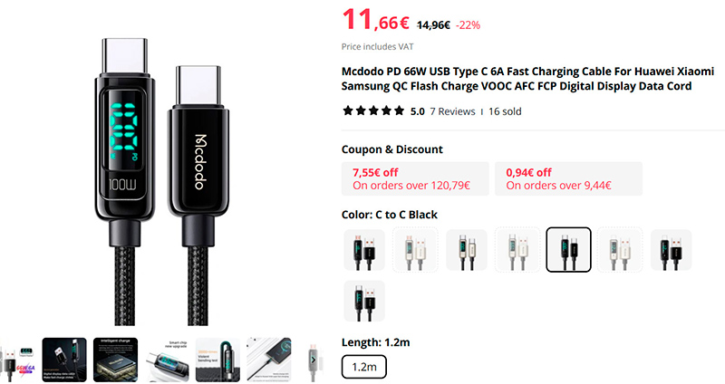 У меня год уже служит вот этот кабель от хорошего производителя Mcdodo, поддерживающий зарядку до 100 Вт и при этом умеющий самостоятельно показывать мощность зарядки безо всяких дополнительных устройств. Это очень и очень удобно, и я вдруг понял, что одного такого кабеля мне мало, поэтому заказал еще парочку (там уже предлагаются такие кабели 2-го поколения, я покупал первого). Там есть модели подешевле, поддерживающие 66 Вт, также есть аналогичные кабели под iPhone с Lightning. Два варианта цветов, длина - 1,2 м.