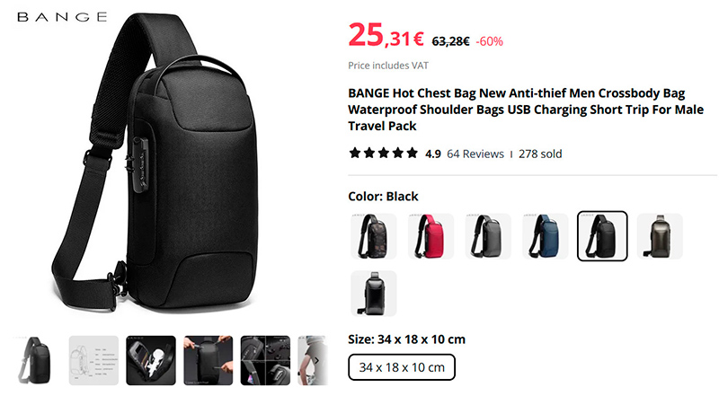 Водонепроницаемая нагрудная (она же наспинная) сумка. Стильная и вместительная. Кодовый замок TSA, порт для зарядки гаджетов, потайные кармашки для пластиковых карт. Семь вариантов дизайна.