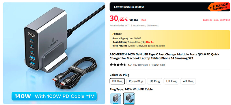 Мощный GaN адаптер аж на 140 Вт от неплохого производителя на пять портов (3xType-C, 2xType-A): поддержка Power Delivery (подходит для различных ноутбуков) и QC 4.0. Есть вариант комплектации метровым кабелем, рассчитанным на 100 Вт.
