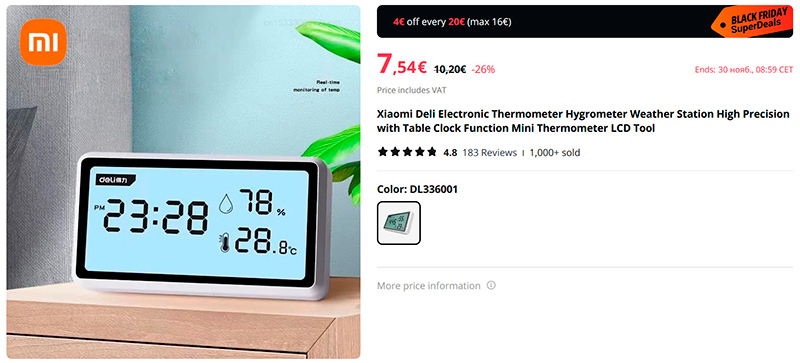 Часы Xiaomi Deli, показывающие температуру и влажность.