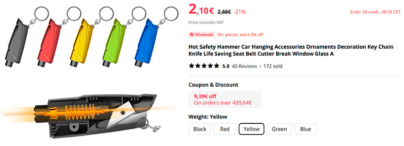 Средство безопасности для автомобиля: брелок с ударным молотком для разбития стекла и с ножом для обрезания ремня. На ключи я такой вешать не буду, а положить в дверь рядом с креслом водителя - полложу.