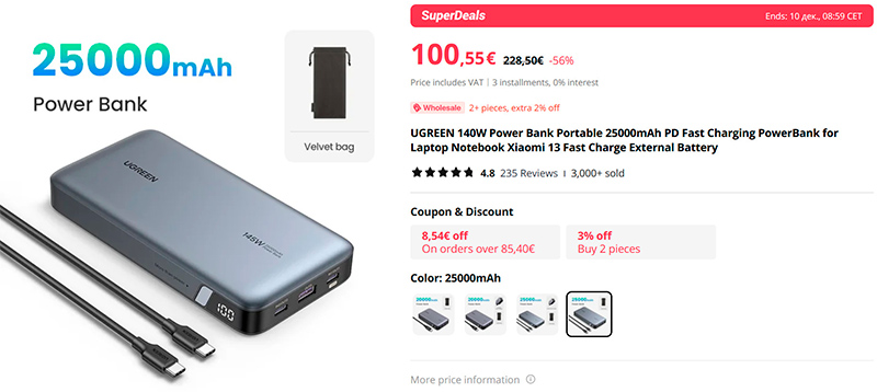 Периодически приходится подолгу работать с ноутбуком без доступа к розетке, и вам требуется хороший внешний аккумулятор для пополнения заряда ноутбука? Вот отличный вариант от Ugreen - мощный внешний аккумулятор на 25000 мАч с поддержкой Power Delivery и с общей мощностью аж 140 Вт, то есть он может заряжать и ноутбук, и еще пару устройств. Три порта, у каждого из двух Type-C максимальная мощность 65 Вт, у USB-A - 23 Вт. Есть дисплей, на котором показывается уровень заряда. Мой ноутбук от такой батарее с нуля зарядится где-то на 95%.