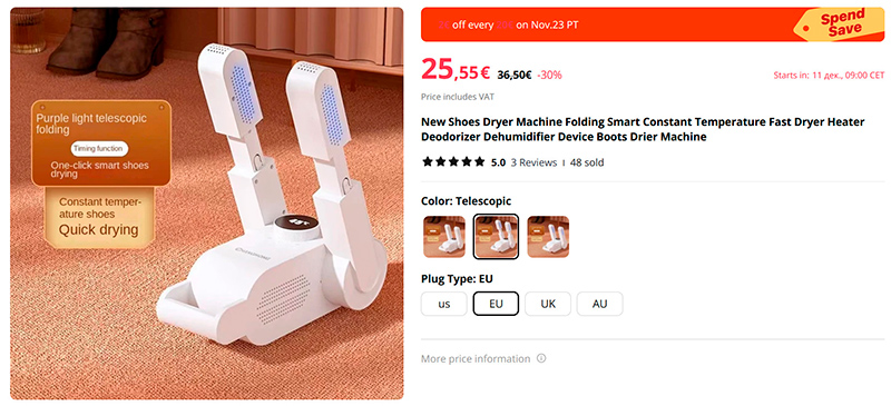 Сушка для обуви - полезная штука в осенне-зимне-весенний период, да и летом тоже может пригодиться, дожди ведь никто не отменял. В Aliexpress появилась новая продвинутая модель такой сушки. Круговой нагрев, складная конструкция, таймер выключения, невысокая (42°C) температура, не причиняющая вреда обуви, подходит для всех типов обуви, носков и перчаток.