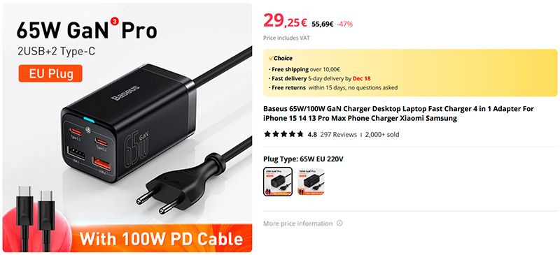 Далеко не всегда розетка располагается рядом со столом, и в этом случае неудобно использовать адаптеры, втыкающиеся в розетку. Но можно не городить огород с удлинителем, лучше просто взять адаптер с кабелем - вот недорогой GaN-адаптер такого рода от Baseus на 65 Вт с полуметровым кабелем для подключения к сети. В комплекте также идет зарядный кабель на 100 Вт. Ну и по той же ссылке есть аналогичный адаптер мощностью 100 Вт, но он несколько дороже.