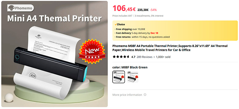 Сверхкомпактный термальный беспроводной аккумуляторный принтер Phomemo M08F формата А4. Подходит для любых сценариев, требующих мобильной печати в поездке, автомобиле, офисе, учебном заведении. Например, печать счетов, контрактов, списков и экзаменационных документов, договоров на месте. Одного заряда аккумулятора хватает на то, чтобы напечатать 120 листов. Может подключаться по Bluetooth к планшету, смартфону, также может подключаться к ноутбуку через USB-кабель. Страница производителя.