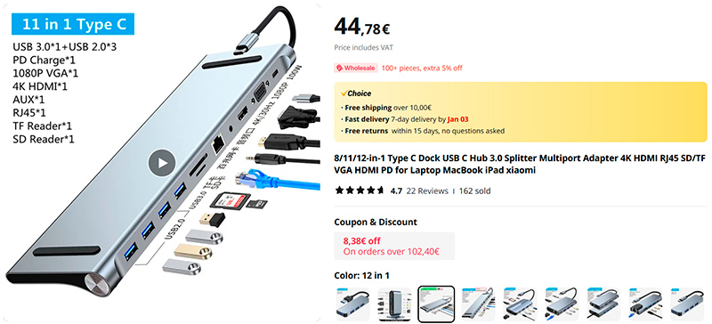 Большой выбор самых разнообразных концентраторов: от "4 в 1" до совершенно демонического "12 в 1", который одновременно служит подставкой для ноутбука.
