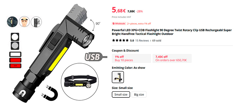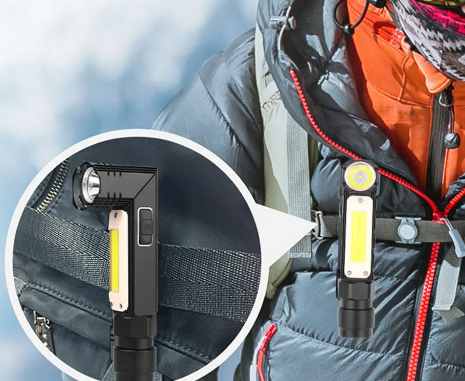 Многофункциональный фонарик: поворачивающаяся светящая головка, дополнительное освещение, вращающаяся магнитная подставка, позволяющая закрепить фонарик на магнитной поверхности. Изготовлен из алюминиевого сплава, водонепроницаемый, имеет крепление для ремня, максимальная мощность - 2000 люмен.