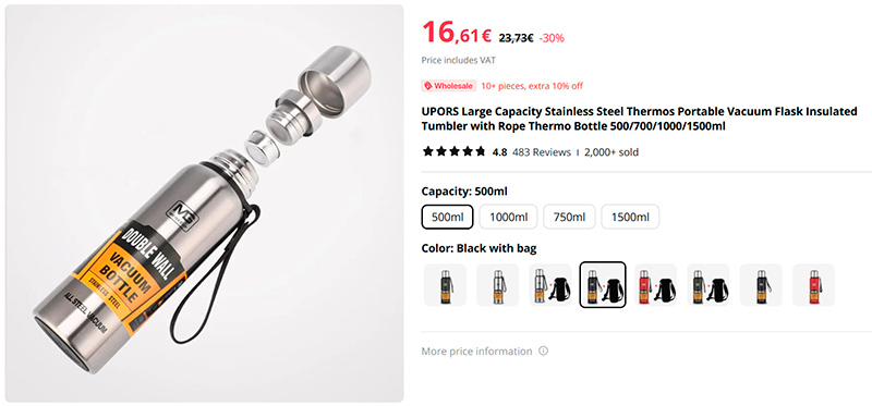Купил у них осенью 2022 года термос на 1.5 литра (скриншот ниже). Термос пришёл абсолютно с неподходящей для него крышкой (не закручивает, чуть меньше, чем надо). Написал продавцу про эту проблему. Он типа как послал нужную крышку. До сих пор жду... Надо бы, конечно, заказать на другой аккаунт ещё один такой термос, а потом снять видео, что крышка не алё и потребовать денег. Но просто лень. И переписки с продавцом уже нет. Но магазин тот же (по ID магазина проверил).