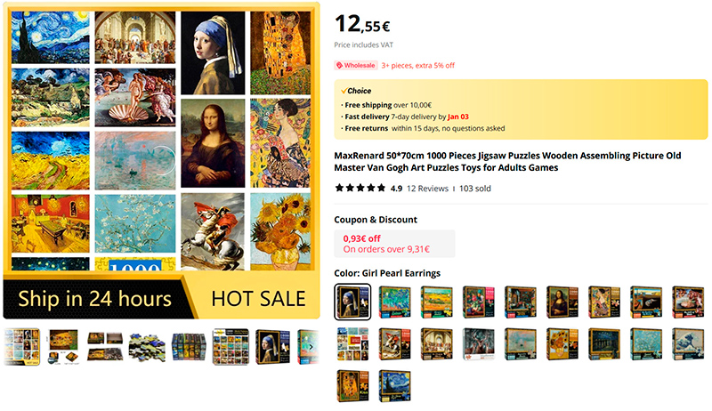 Для любителей пазлов - наборы на 1000 частей с картинами старых мастеров. Размер - 50х70 см.