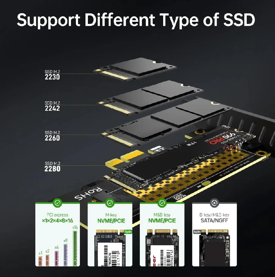 У меня была проблемка - на материнке Asus на моей для второго NVME SSD плохое крепление, видимо заводской брак, поэтому использовал только первый SSD разьем и думал, как бы поставить еще один (бифуркация материнкой не поддерживается, поэтому только для одного ssd). И наткнулся на китайский адаптер на али, ссылку дам ниже, для PCI 3/4. Приехал адаптер неделю назад, воткнул на него имеющийся ssd от kingston и в принципе был удивлен, что все замечательно работает и даже скорости поддерживает родные от этого ssd - это 3500 на чтение и 2400 на запись, тесты подтверждают и меня это полностью устраивает.