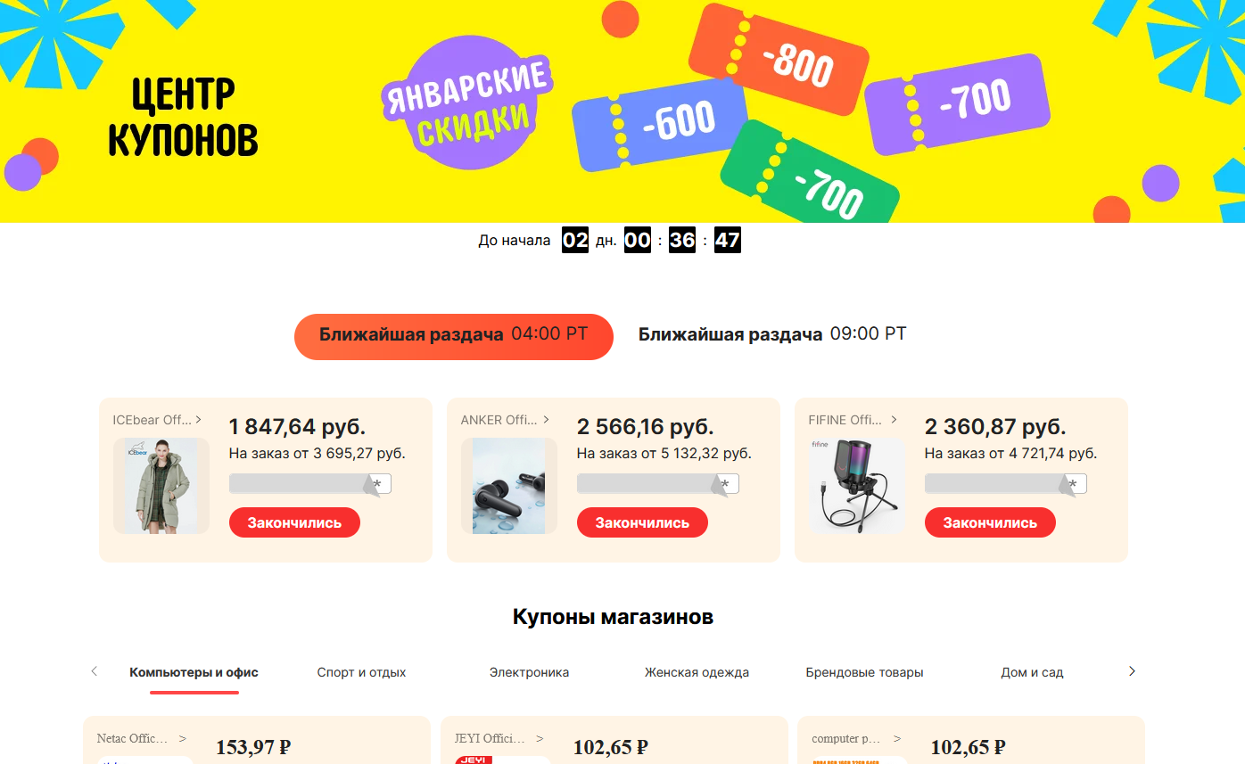 Из интересного - это раздача купонов на определенные товары на странице с купонами продавцов и на китайских брендах в 15:00 и 20:00 каждый день.