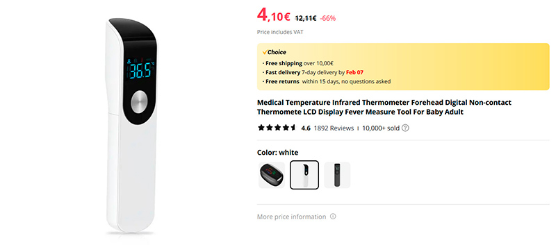 Новая модель дистанционного термометра. Два цвета - белый и черный. Под 2000 отзывов, средняя оценка 4,6. Имеющиеся некоторые негативные отзывы, видимо, связаны с тем, что люди просто не разобрались, как такие термометры работают. Их нужно направлять в переносицу и держать на расстоянии где-то 2-3 сантиметров. Мы в семье много лет пользуемся аналогичным термометром Mi Health, но они из продажи давно пропали.