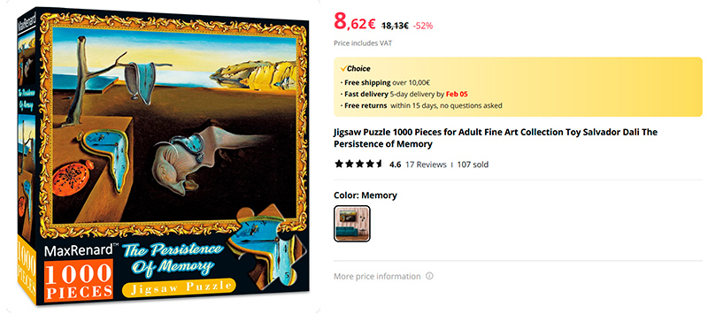 Для любителей пазлов - одна из самых знаменитых картин Сальвадора Дали "Постоянство памяти". Оригинальная картина находится в Музее современного искусства в Нью-Йорке с 1934 года. Вы можете сделать копию из 1000 кусочков пазла. Толщина каждого кусочка - 2 мм. Размер получившегося изображения - 68х49см.