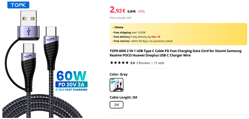 С этими адаптерами для зарядки нынче не поймешь, какой кабель брать. Одни - с портом USB-A, другие - с Type-C. Хороший выход - взять универсальный кабель Type-C с переходником под USB-A. Два метра - до любого смартфона дотянется! И он поддерживает Power Delivery до 60 Вт, так что для ноутбуков тоже сгодится.