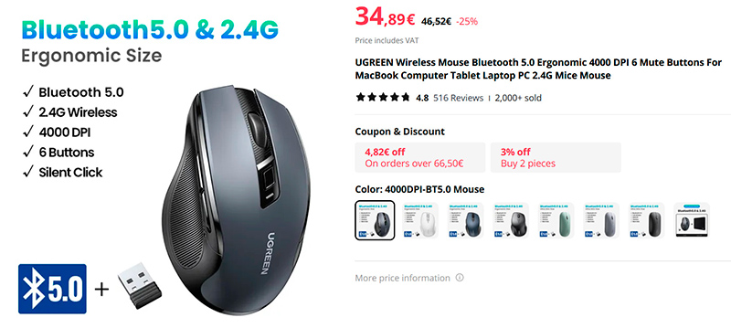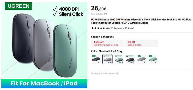 Компактные и недорогие мышки от Ugreen. Три цвета, есть универсальные версии - подключение по Bluetooth 5.0 или через специальный адаптер, причем версии с Bluetooth дороже всего на 5 евро. Отлично подходят для переноски в сумке, потому что почти плоские. Разрешение 4000 DPI, очень тихие кнопки и ничего лишнего.
