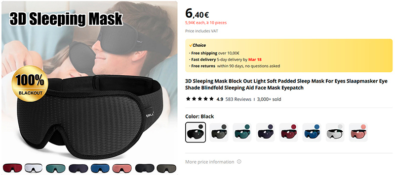 Удобные и эффективные 3D маски для сна. Дышащий материал, регулировка посадки, имеет вырез для носа. Восемь вариантов цветов. Если использовать, то только такие. У меня раньше была простенькая - просто тряпочка, так это вообще не то! А вот такая, соответствующей формы - решает все проблемы со сном, когда в комнате недостаточно темно.