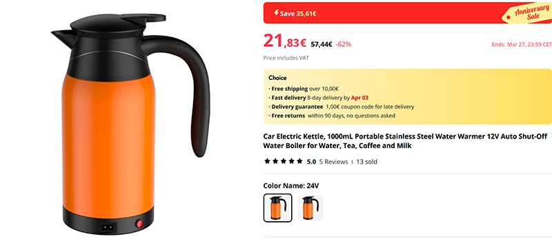 Недорогой литровый чайник-термос для автомобиля с питанием от прикуривателя (12V или 24V). Стальной, крышка плотно закрывается, исключая протечку, чтобы налить воды, достаточно нажать на кнопку, на крышке есть дисплей, показывающий температуру. От адаптера 24V нагревает литр воды до кипения за 25 минут.