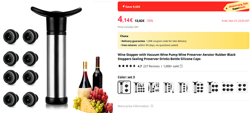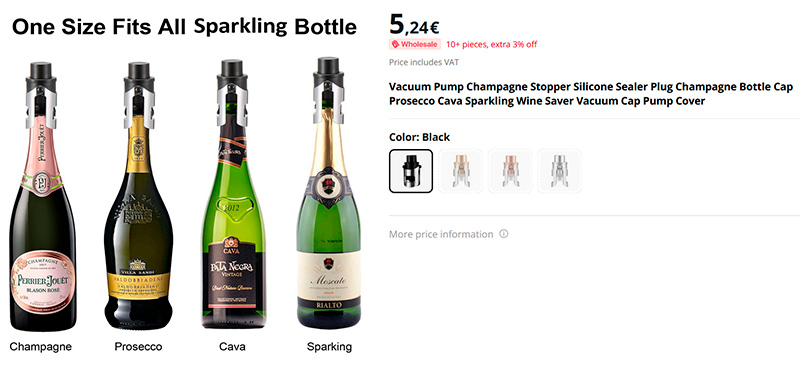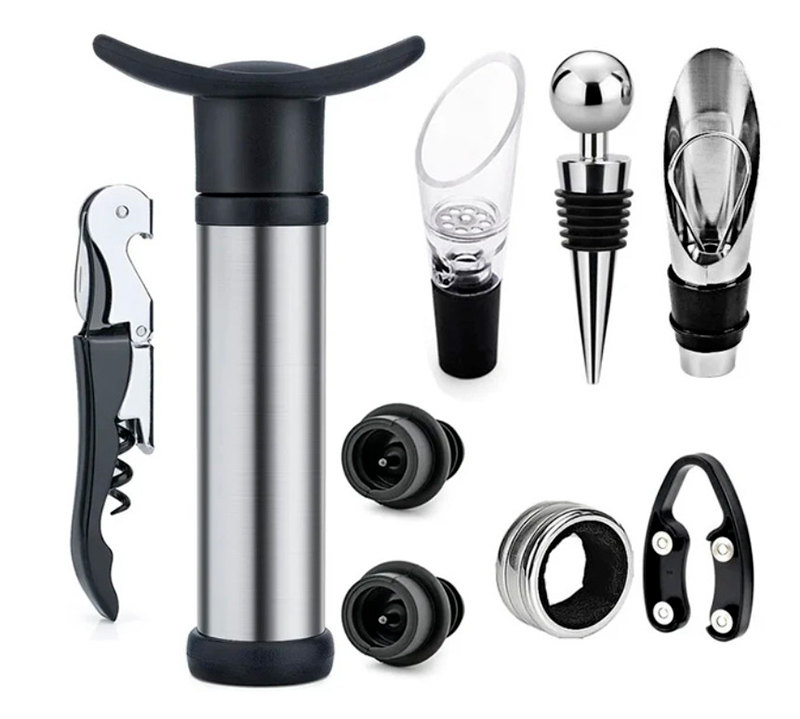 И там есть разные комплектации: по 4 или 6 пробок в комплекте с помпой, пробки отдельно.  Также есть вот такой продвинутый комплект со всеми необходимыми аксессуарами: помпа, пробки с клапаном, официантский пробочник, два вида аэраторов, притертая пробка, кольцо на бутылку (чтобы не стекали капли вина), нож для срезания крышечки фольги.